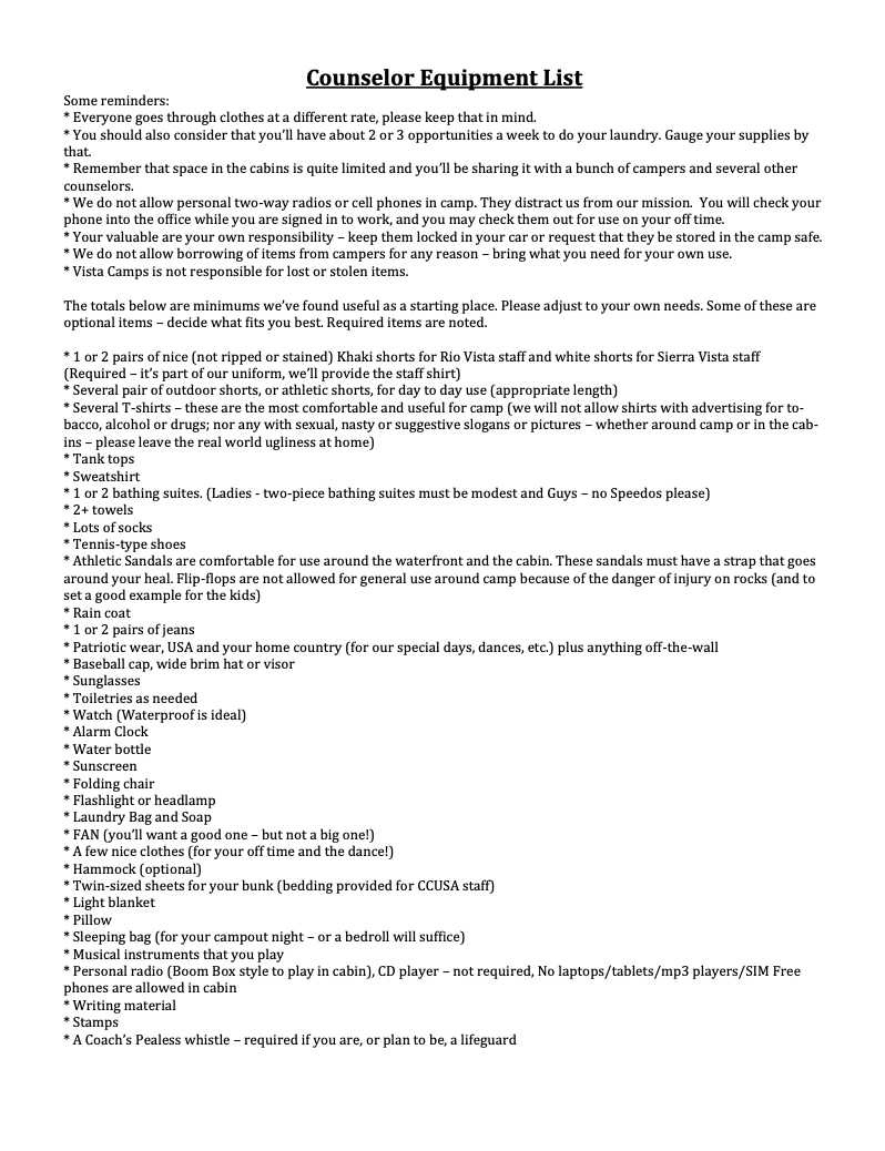 As you prepare for your time at camp, we’ve put together this packing list to serve as a helpful guide. It’s not an exhaustive checklist—every counselor has their own preferences and essentials—but it should give you a solid starting point as you get ready for the season.